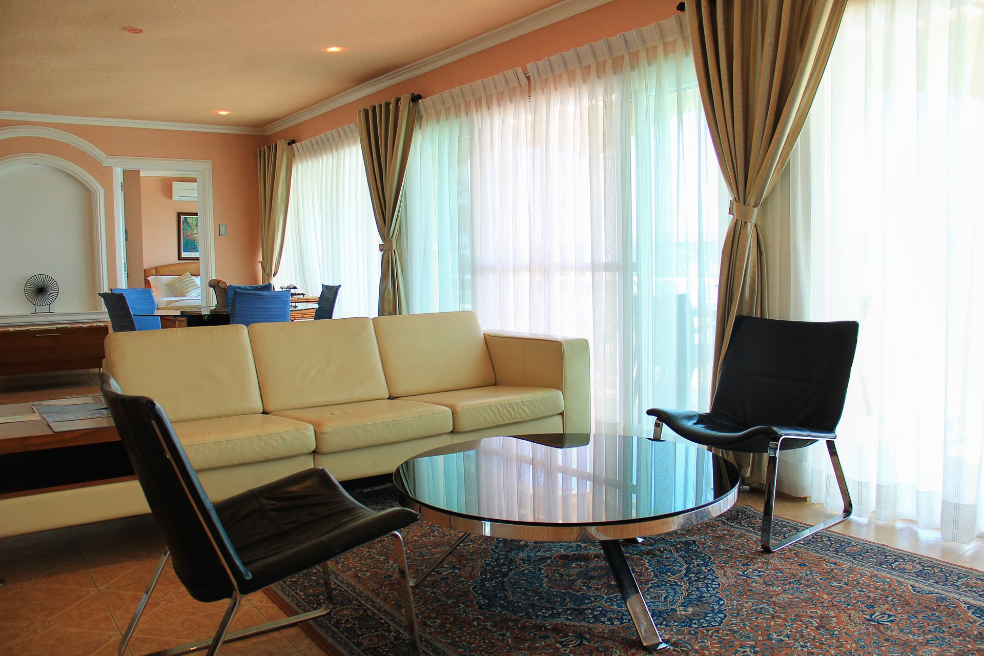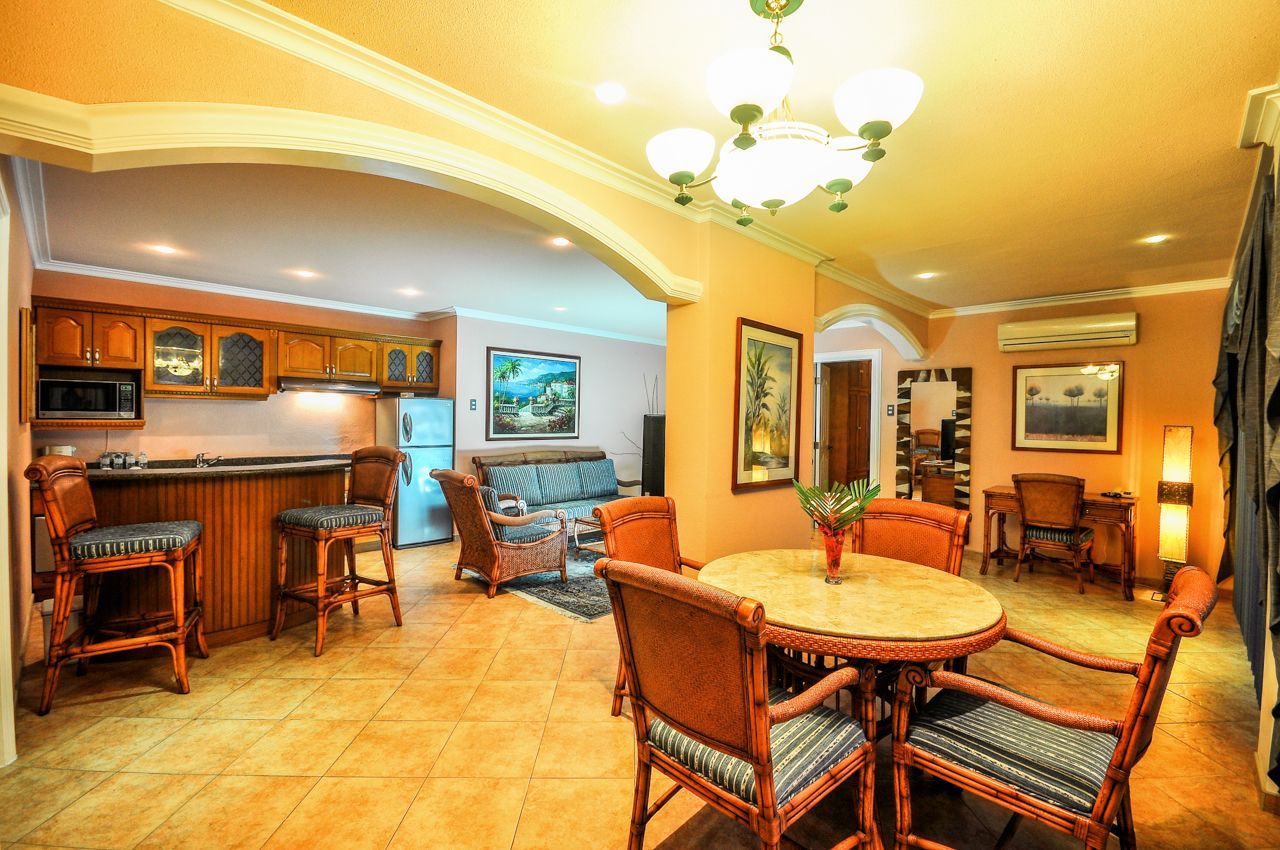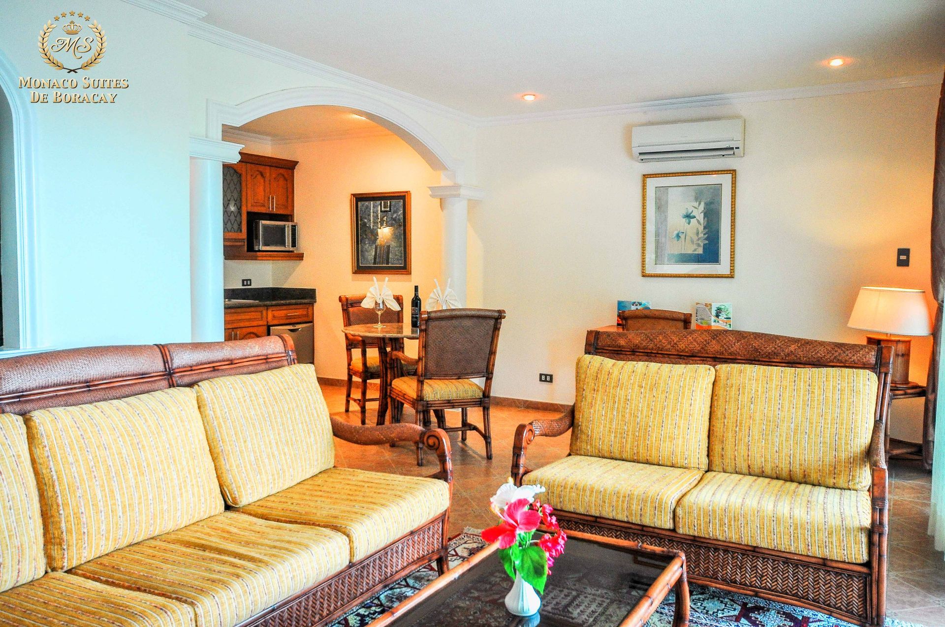 Breakfast at Monaco has 9 one-bedroom suites. Each bedroom features a large bed, and each living space features a sofa and chairs as well as a dining set.
